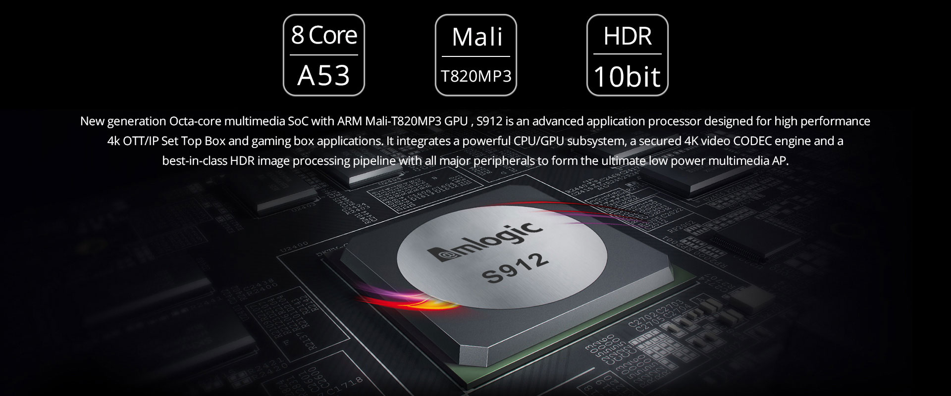 | Processor | Amlogic S912 octa-core 64bit Cortex-A53 Up to 2.0GHz | ||